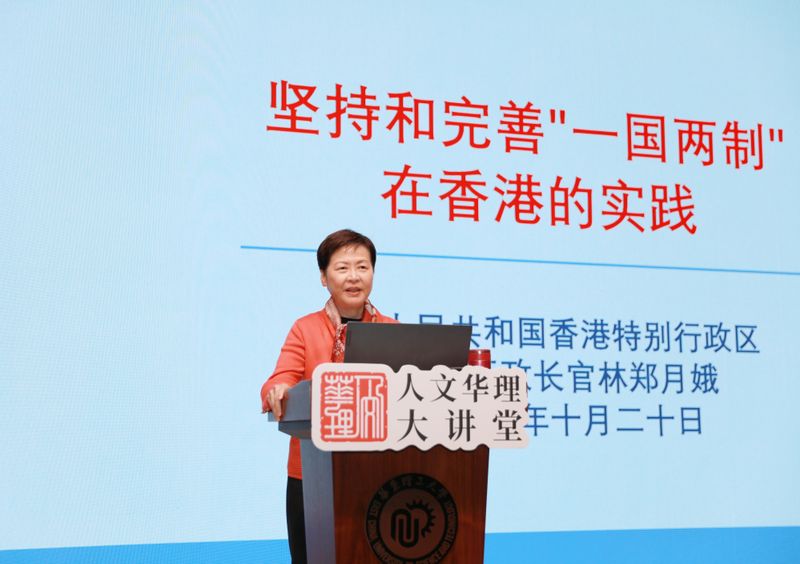 图片说明:香港特别行政区第五任行政长官林郑月娥女士作报告